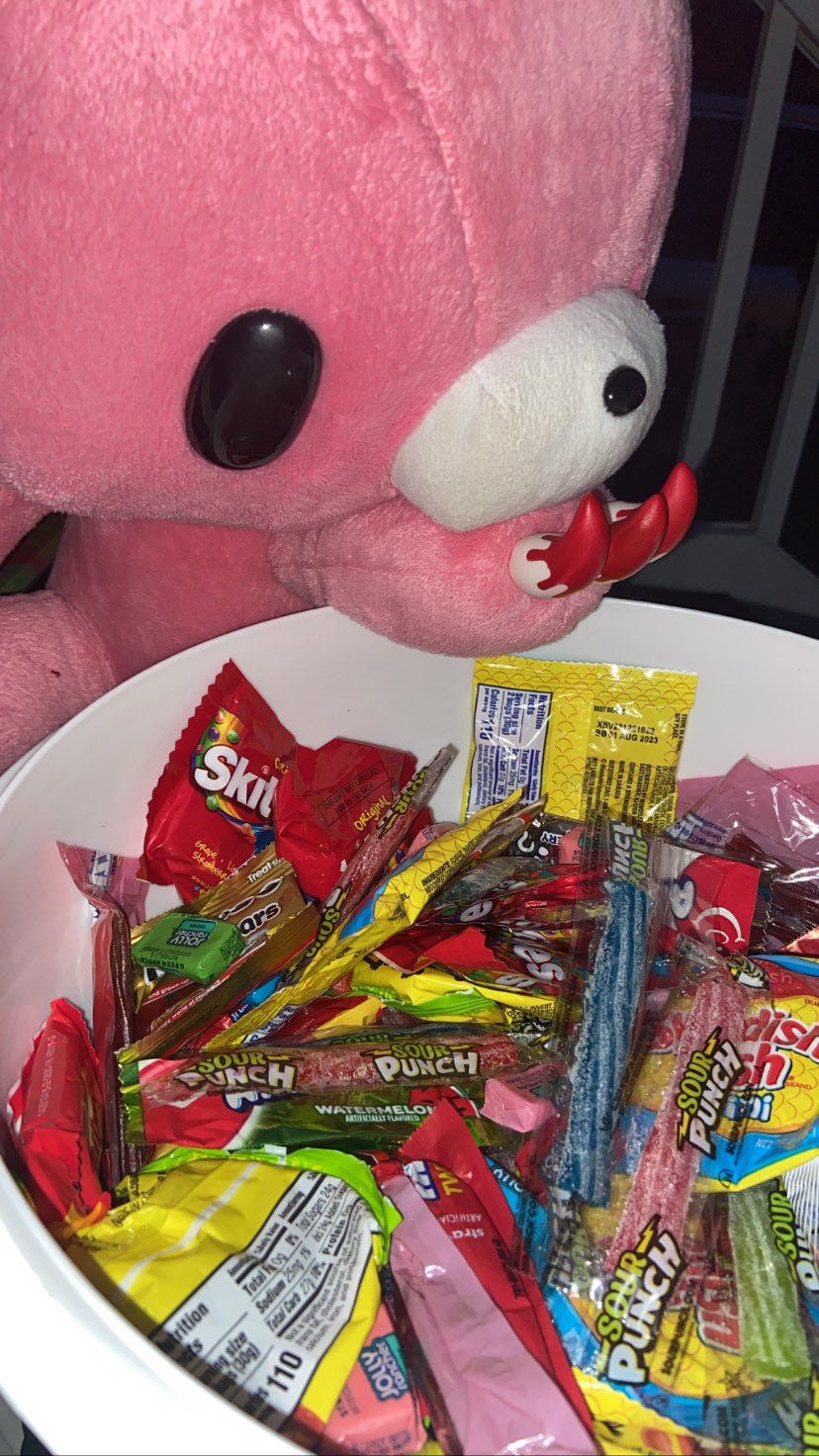 An electronic music album I’ve been really enjoying is La Femme’s Paradigmes, which is sultry and full of adventure—like you’re on the subway, hopping car to car to overhearing people’s woes. It’s fun too! Every song (especially the stretch of ‘Lâcher de chevaux’ thru ‘Force & Respect’). Where you’d least expect it, a banjo shows up in “Disconnexion”. There is a strong reading of spooky with the music’s ghostly vocals, scurrying synth, figures darting across a dark forest of trees, and electronic tummy rumbles throughout. Actually, this is the album I played on my porch to welcome trick-or-treaters on Halloween. I am glad I sticked to my guts and played music I liked—and thought fit the occasion—instead of the pre-made Halloween playlists on spotify (nothing wrong with that, though). I just thought, if I’m posting up here for a few hours, I’m gonna play music I especially enjoy and want to share with suburbanites (Thank you to my friend Stephanie, whose good taste in music put me on to La Femme). When the album ran through, I selected songs from the Hylics video game soundtrack. I am proud of the porch atmosphere I created: music, my sketchbook, a bowl of assorted candy, and my Gloomy Bear plushie looming on a chair next to mine.